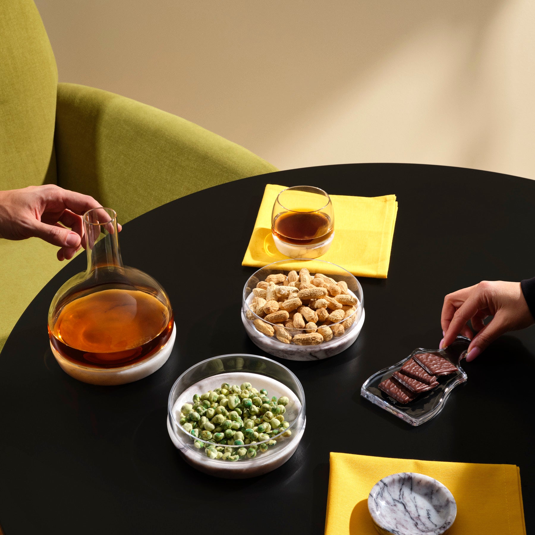 Each piece pairs lead-free crystal with a marble base, keeping every pour and every plate perfectly chilled. Refined, versatile, and effortlessly sophisticated.